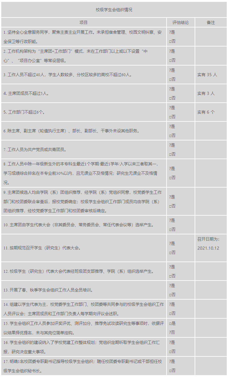 為落實(shí)共青團(tuán)中央、教育部、全國(guó)學(xué)聯(lián)聯(lián)合下發(fā)的《關(guān)于推動(dòng)高校學(xué)生會(huì)(研究生會(huì))深化改革的若干意見(jiàn)》,接受廣大師生監(jiān)督,現(xiàn)將我校截至2021年11月學(xué)生會(huì)改革情況公開(kāi)如下。