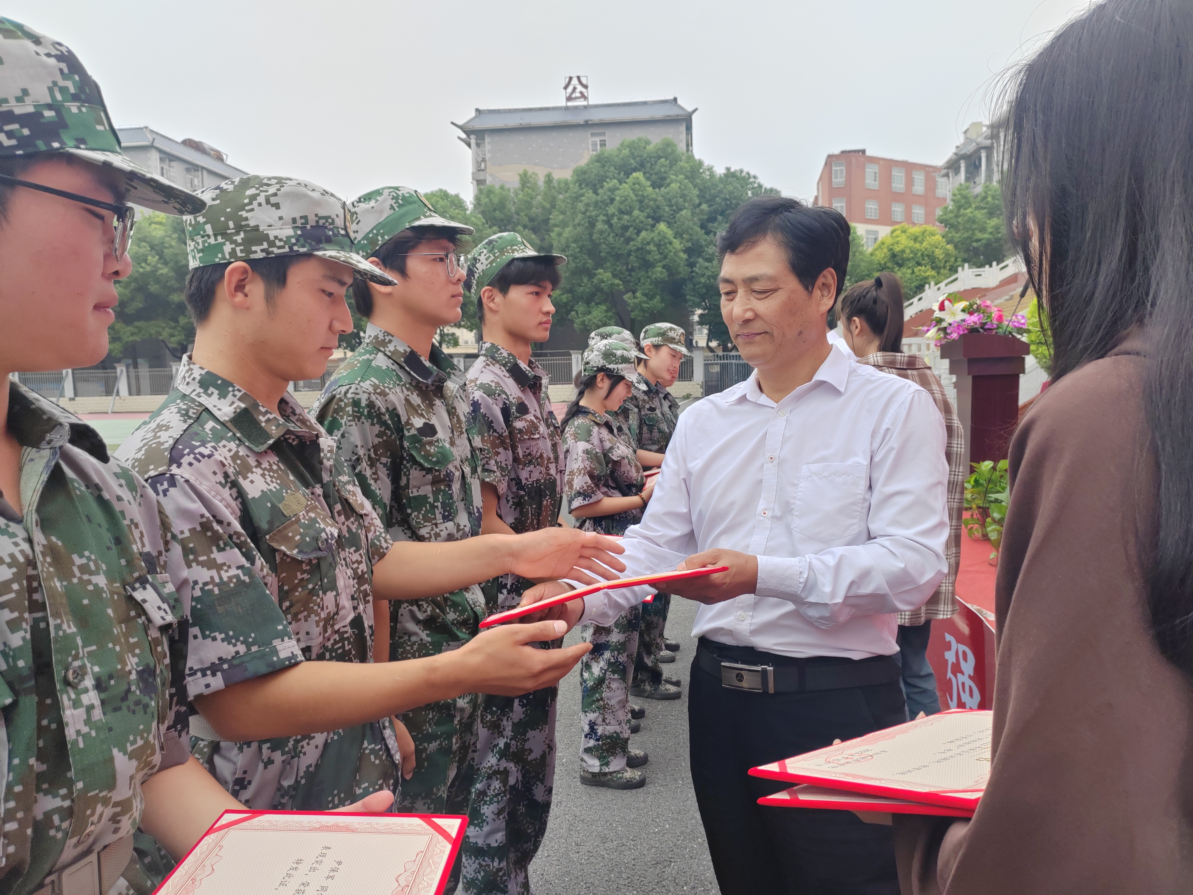 隨后,學(xué)生代表向軍訓(xùn)教官獻花。閆玉聯(lián)院長宣讀了2023年軍訓(xùn)表彰決定,決定授予李會會等40名同學(xué)“訓(xùn)練標兵”榮譽稱號,主席臺領(lǐng)導(dǎo)為“訓(xùn)練標兵”頒發(fā)證書。
