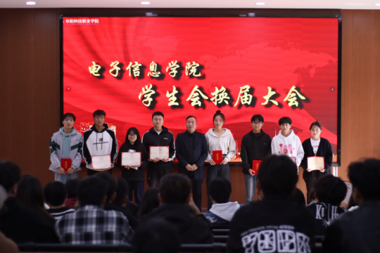 2024年11月6日,阜陽(yáng)科技職業(yè)學(xué)院電子信息學(xué)院在西街教室一樓舉辦了學(xué)生會(huì)換屆表彰大會(huì)。出大會(huì)的有阜陽(yáng)科技職業(yè)學(xué)院團(tuán)委副書記劉可欣、學(xué)生會(huì)負(fù)責(zé)人高陽(yáng)英杰、及學(xué)生會(huì)成員。